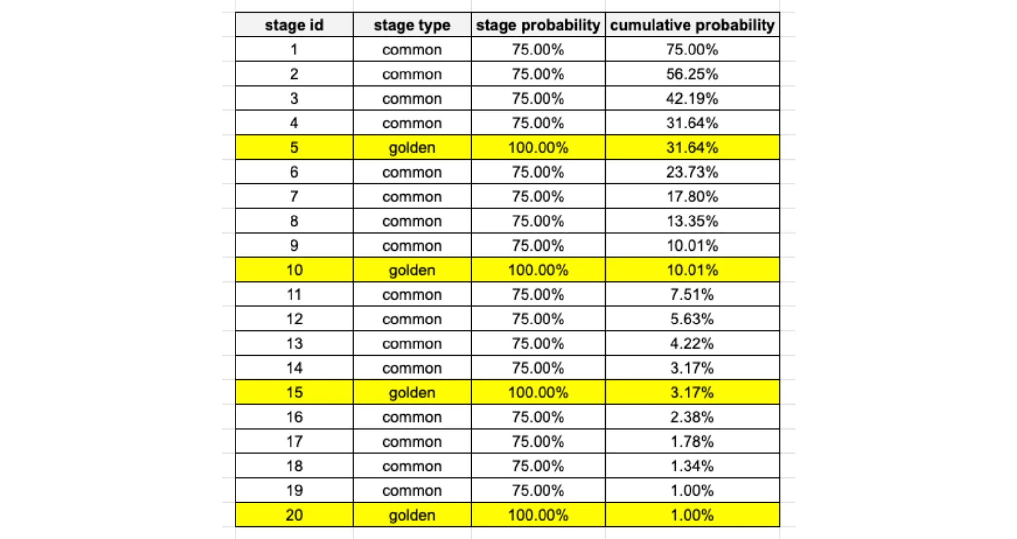 The probability of win on each stage are high 75%-100%, depends on a stage type. It’s so easy to feel by player. It’s so intuitive that you have a very high probability of win when you are choosing one barrel of four and three of them with the prize. But the cumulative win probability decreases so quickly. The player can’t intuitively feel that chances of win are 10% on the 9th stage and only 1% on the last one.